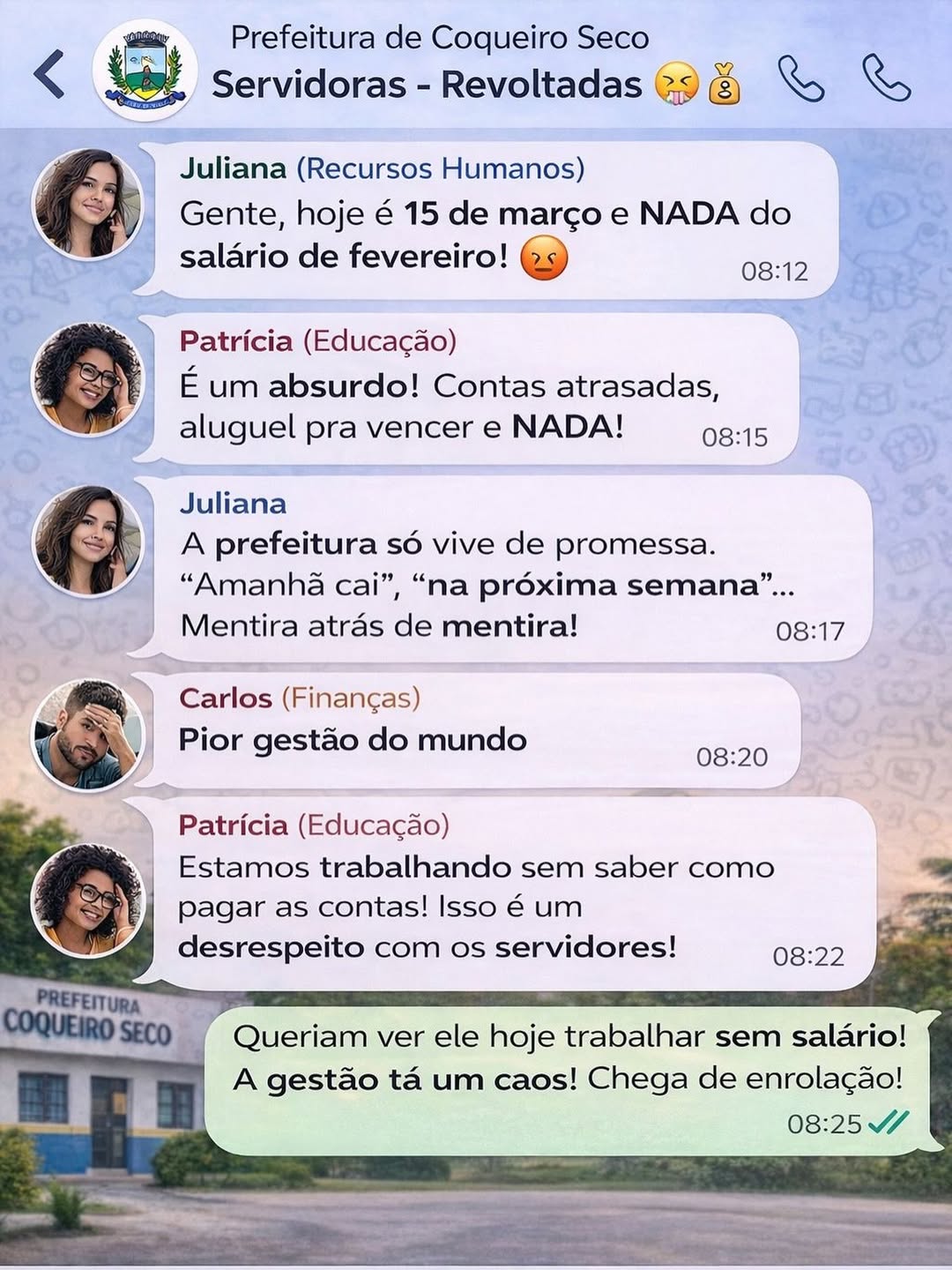 Em uma das mensagens compartilhadas, um servidor afirma: “Hoje é 15 de março e nada do salário de fevereiro”. Em outro trecho, há críticas diretas à administração municipal, com a gestão sendo classificada como “a pior do mundo”.