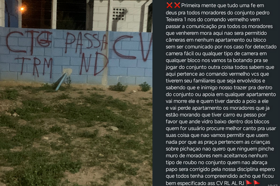 Nos textos que circulam, os autores se identificam como integrantes da facção Comando Vermelho e impõem regras rígidas dentro do residencial. Eles proíbem a instalação de câmeras, ameaçam moradores que apoiem “inimigos” de outros grupos e determinam punições severas, como expulsão e até morte. Também pedem que carros circulem com vidros abertos e vetam o uso de drogas nas praças.